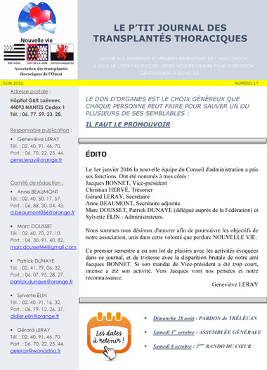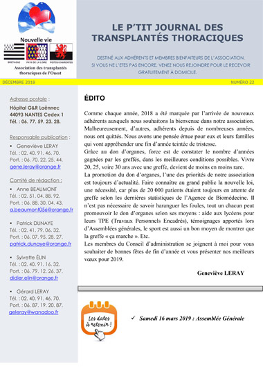 Chaque semestre, le "P'tit journal des Transplantés Thoraciques" est édité. Il a pour but de tisser un lien entre tous les membres de notre association et de les informer sur les activités écoulées (réunions, manifestations, actualité ayant trait à la santé)